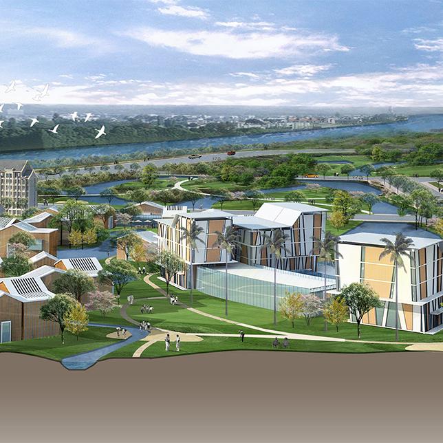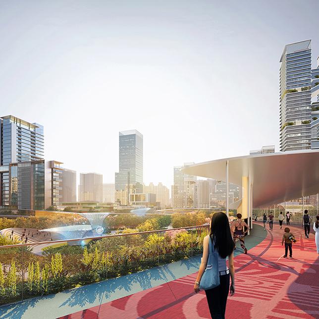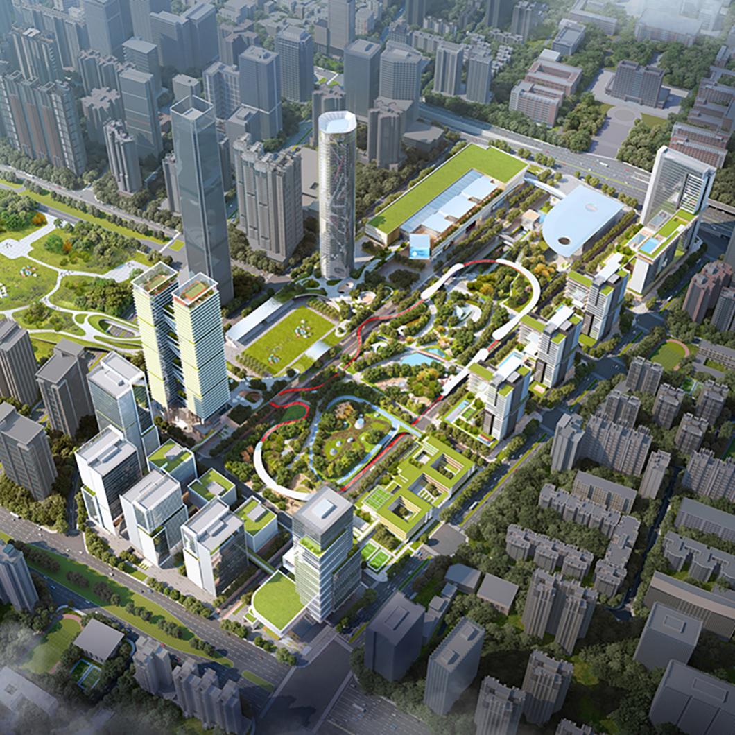 在本次设计中,一方面构建在区域空间格局层面,将形成形成双长廊、 双客厅格局。树立一个链接双公园的城市地标集群引领城市天际线,北侧一组谦逊的文化集群朝向暨南大学,彩虹环廊与绿芯公园串联其中,形成珠江新城东区新形象。