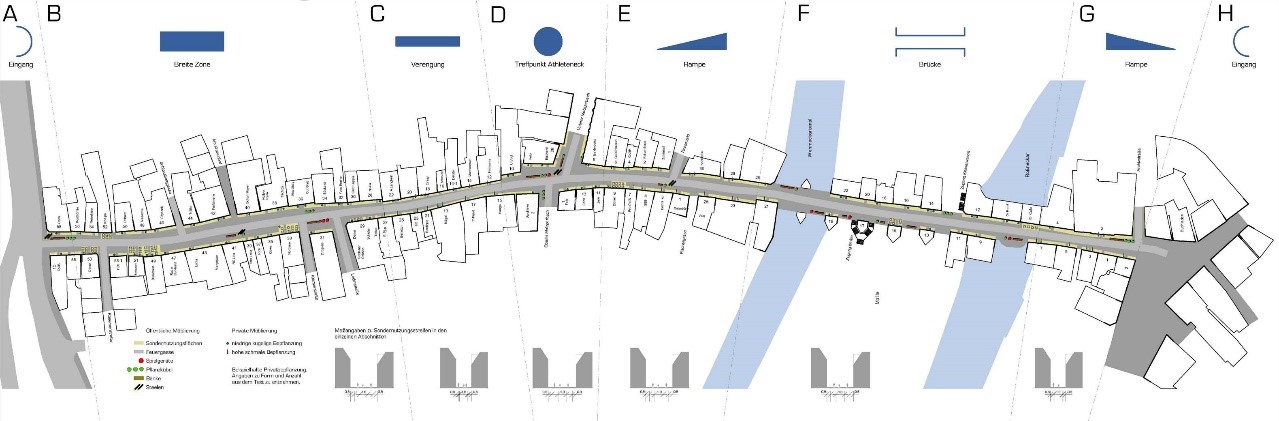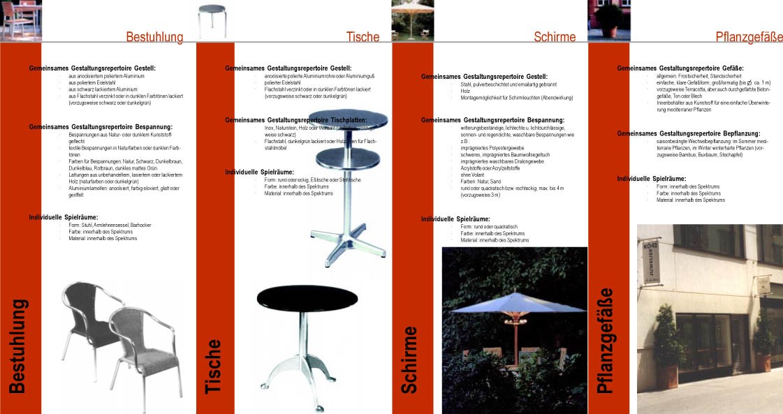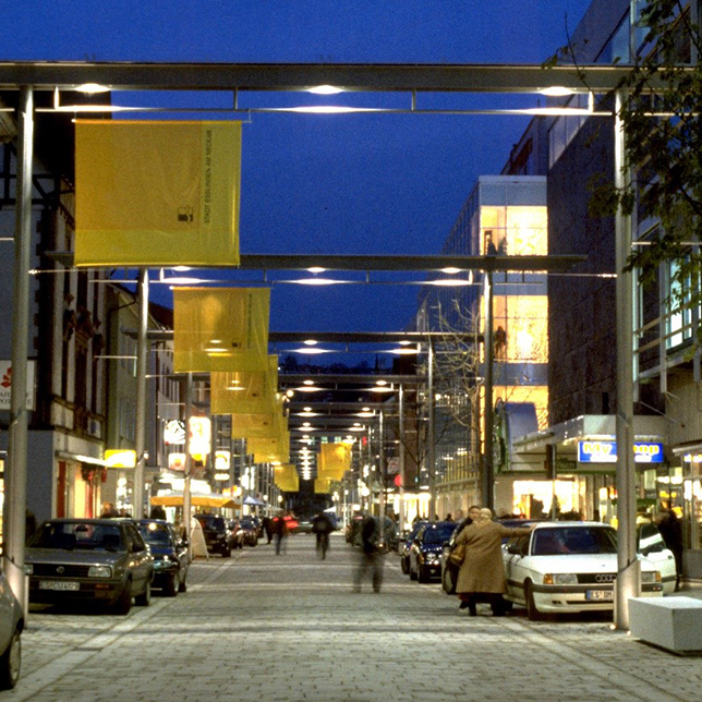 他们对整个的行人区提出自己的具体特征, 带有照明和临时的挂旗作为装饰,在特定的节日时对挂旗进行更换。他们给街道气氛的形成发挥了重要作用。对整个地区的设计指引和不同的商业活动完成了此概念。