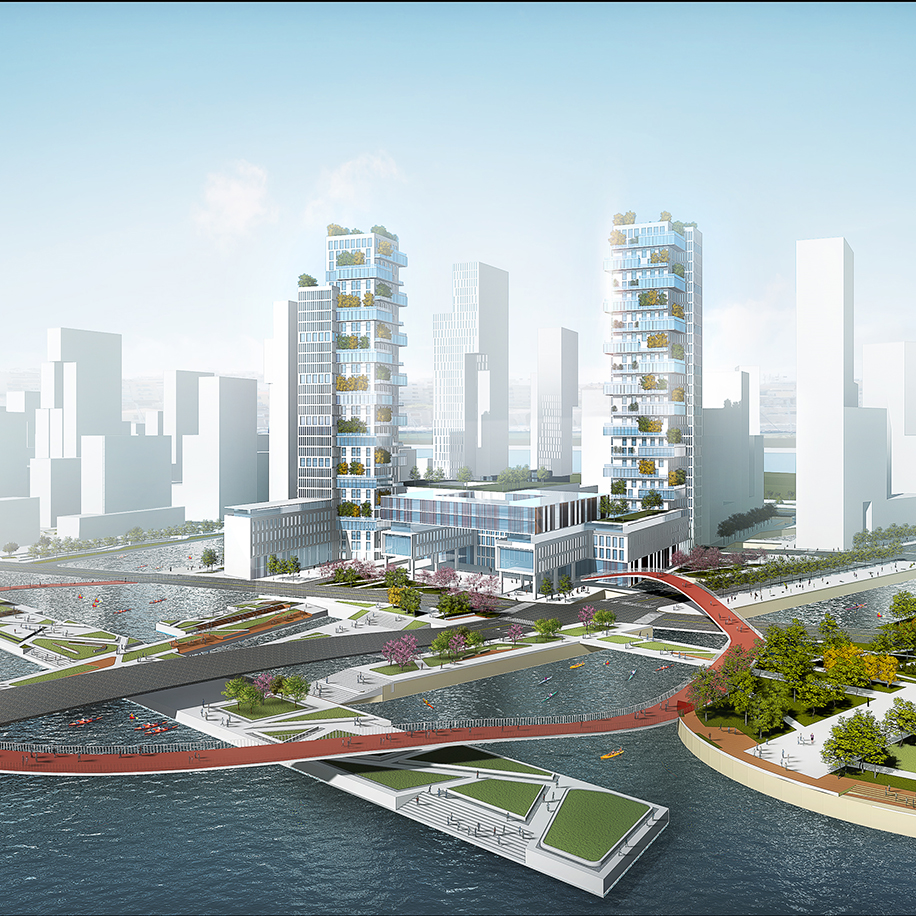 深圳海洋新城项目是我们对与海共生理念的一次综合实践,作为深圳市继前海后获得的一个稀缺战略性发展空间,项目对城市开发强度、体量及功能都提出了很高的要求,但另一方面,由于基地位于深圳大空港地区西北部,珠江河口围填地区,整个城市设计工作必须在截留河和生态湿地等多种设定下完成,导致任务书中将如何生态用海、生态营城、发展海洋产业列为三大核心议题。在给出的城市设计解决方案中,我们将人海共生设定为整个设计的出发点,在借鉴学习全世界案例的成功经验下,试图通过人为适度干预+生态自然修复两种相互结合的方式协调城市、海洋、生态三者之间的关系,最终塑造一种与自然共生、与海洋共生的新型海洋新城。