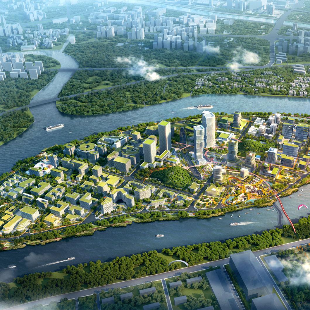 本次城市设计通过“元素+连接”设计理念在生物岛现状已建及已出让地块的基础上,植入新岛屿门户及景观节点,通过环岛碧道/活力智慧步廊/道路景观进行串联,形成全新的空间序列。整体塑造广州生物岛世界级的生物医药与生命科学研发基地的城市形象,落实生物岛管委会在开发实施中面临的产业/配套/景观环境等方面需求,打造一座以领先智能技术为支撑,集聚尖端生物科技企业、人才与信息的安全智慧岛,国际化大都市中与自然共生环境优美的生态绿洲。
