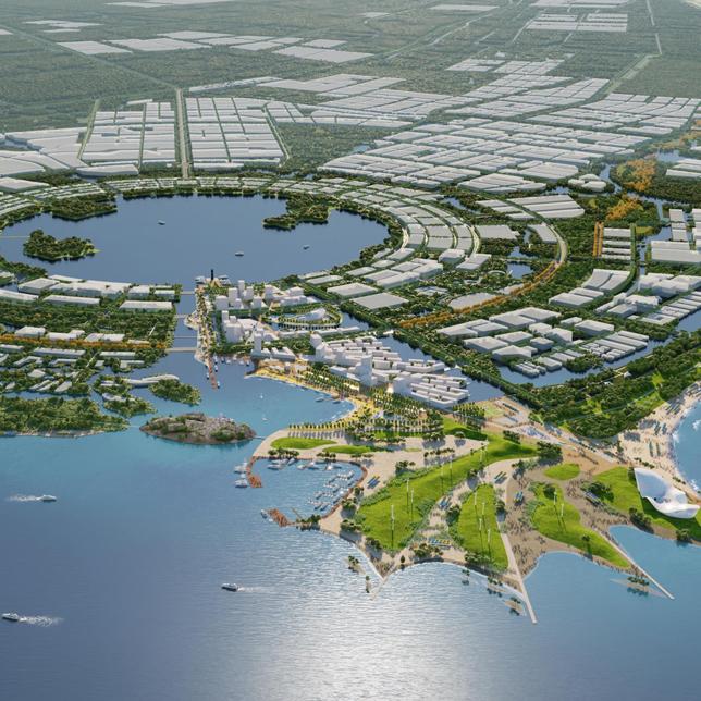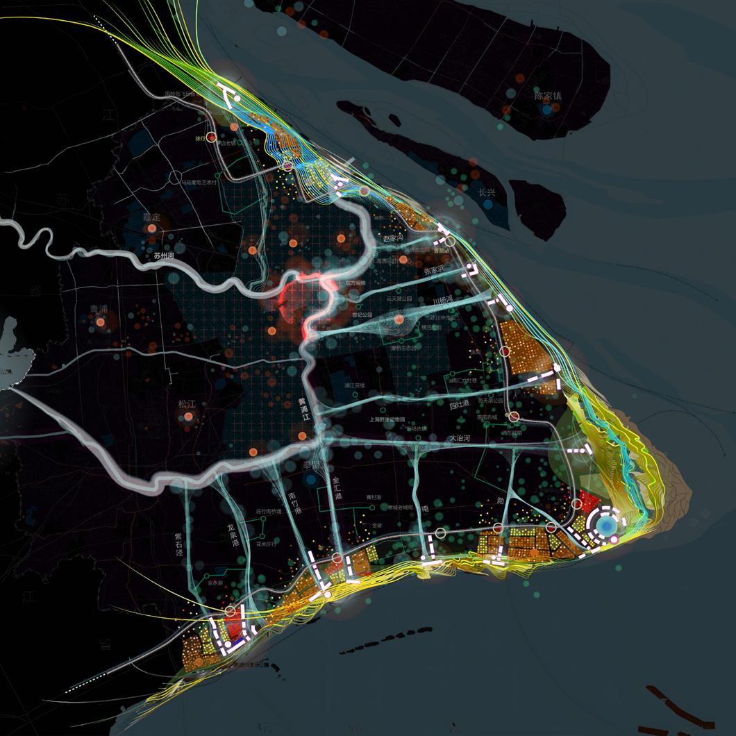 V型海岸带的生态空间方案,旨在联通上海与海洋,统筹历史演进、海流动力、海洋生态、产业、文化的多维价值,横向上自黄浦江“再出发”,引13港沿着城市发展断面自江达海;纵向上构建“Dune+Dike”“双D”海岸系统,将线性海堤转化为新的韧性海岸。横纵交织处,12个旗帜区域各具特色,“旌旗海岸”将成为上海V型海岸带享誉世界的新IP。